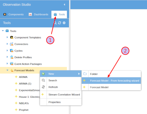 Select the Tools tab and then right clicking on Forecasting Models, or a model folder, and choosing New - Model from Forecasting Wizard: