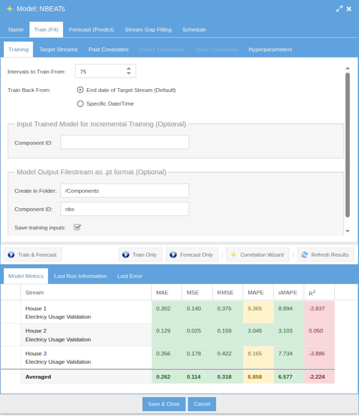 - Train Only: Trains a model using target streams and optional covariates. The trained model can be saved to a file stream for later use if the model supports native saving. The entered component ID for saved models must have to file streams with IDs: trainedModelPt and trainedModelCkpt