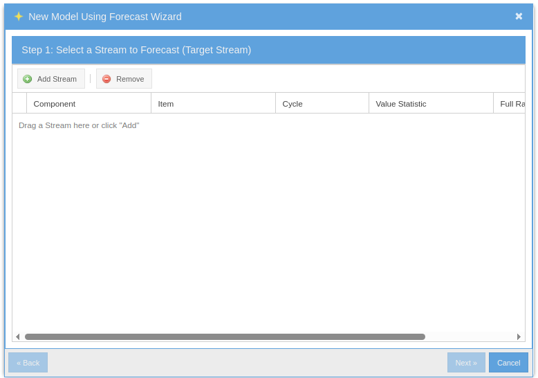The first step of the wizard is the selection of the stream to be used for training: