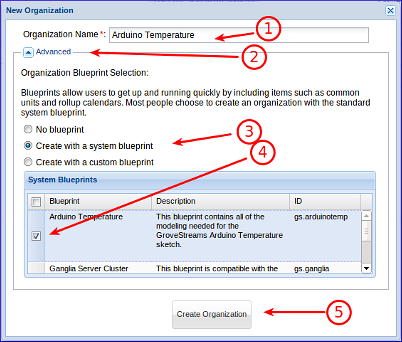 4. Select the Arduino Temperature system blueprint. This will create your organization with commonly used items such as units.