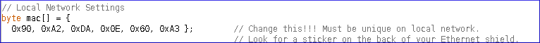 Next you will need to edit the mac and gsApiKey sketch variables within the Local Network Settings and GroveStreams Settings section of the sketch: