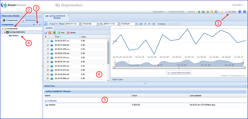 This tutorial will walk through the creation of a GroveStreams user account, an organization, and Java code that uploads random numbers.