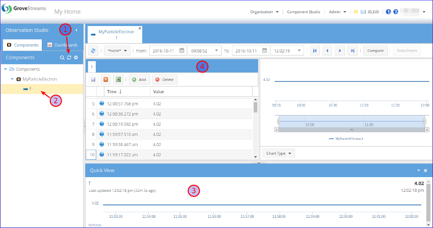 This example was made simple by allowing GroveStreams to create a default component with a default stream. GroveStreams will do its best to determine if the stream type is a number, text, or boolean based on the first sample arriving. Users can view or modify existing component definitions by right clicking on them and selecting Edit Component. Modify any component attributes except the component and stream IDs. Consider using component templates to avoid having to edit every component after it registers.