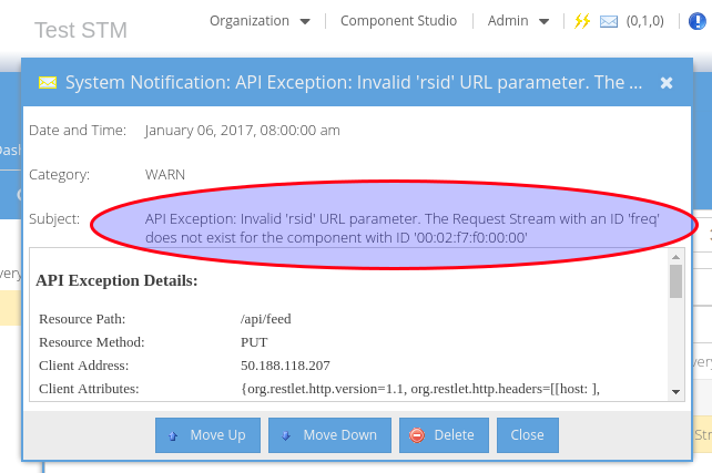 Successful API calls to GroveStreams should return a status of: HTTP/1.1 200 OK.If the call made it to a GroveStreams server, but an error still occurred, a GroveStreams system notification will be created that contains the error. While in the GroveStreams organization's Observation Studio, click on the Notifications button located in the top toolbar (It looks like an envelope) and select the System tab. Click Refresh to list new notifications.