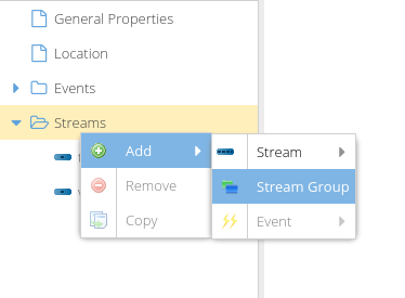 Within the component editor, select the Streams folder, right-click, and select Add - Stream Group