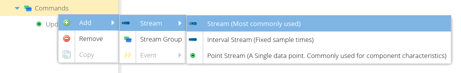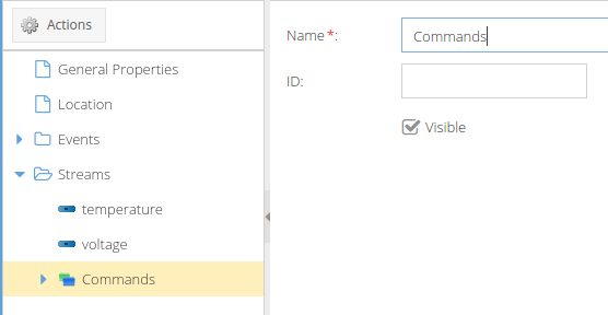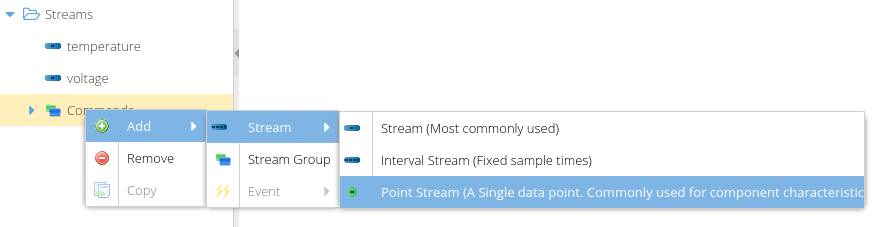 This section explains how to manually add two command streams to the component. Command streams are streams, just like other streams. They can be Regular, Interval, or Point streams. The device will poll for the latest value from these streams. A dashboard in Step 3 will be created that allows values to be easily appended to the end of streams so that they can be picked up from the device.