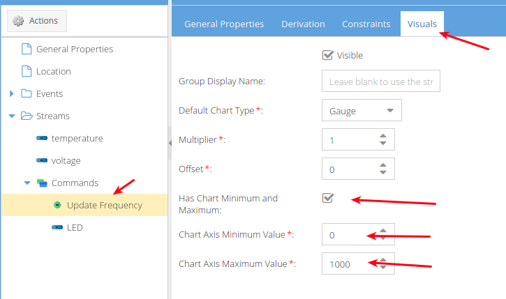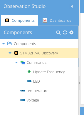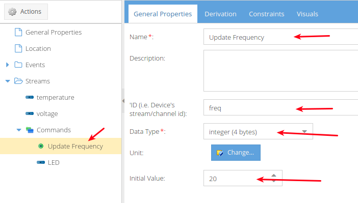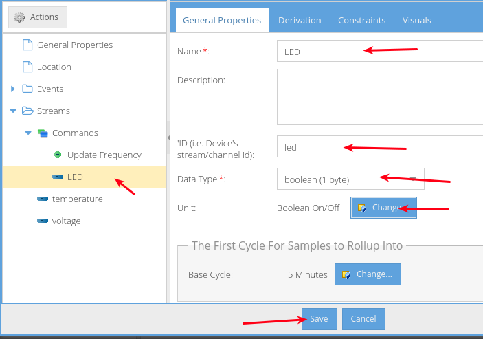 - The component has two manually added command streams: LED and Sample Frequency. These streams will hold command and setting values that are used by the device. We chose a Regular stream type for the LED Light stream so that a historical record of commands is tracked. We chose a Point stream type for the Sample Frequency because we only want to store the last value.