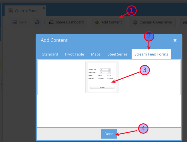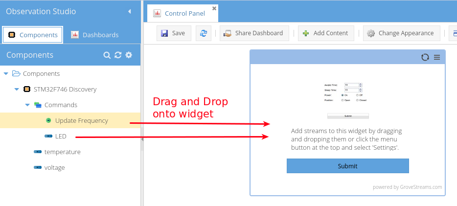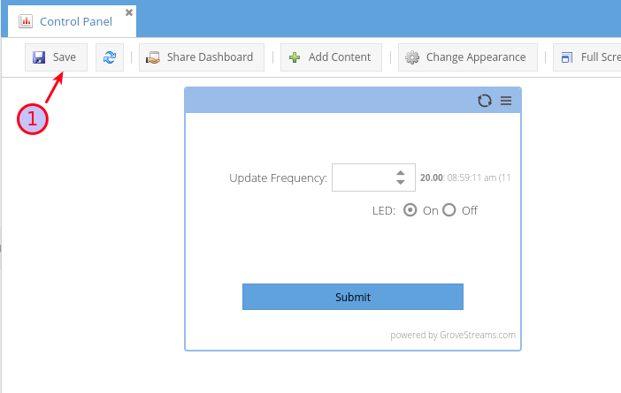This section explains how to create a dashboard that allows the board's sample frequency and the LED state to be changed from a GroveStreams dashboard.