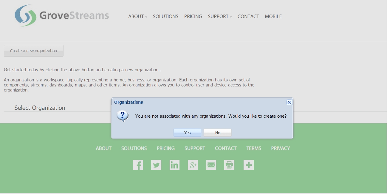 You will be prompted to create an organization. Select Yes: