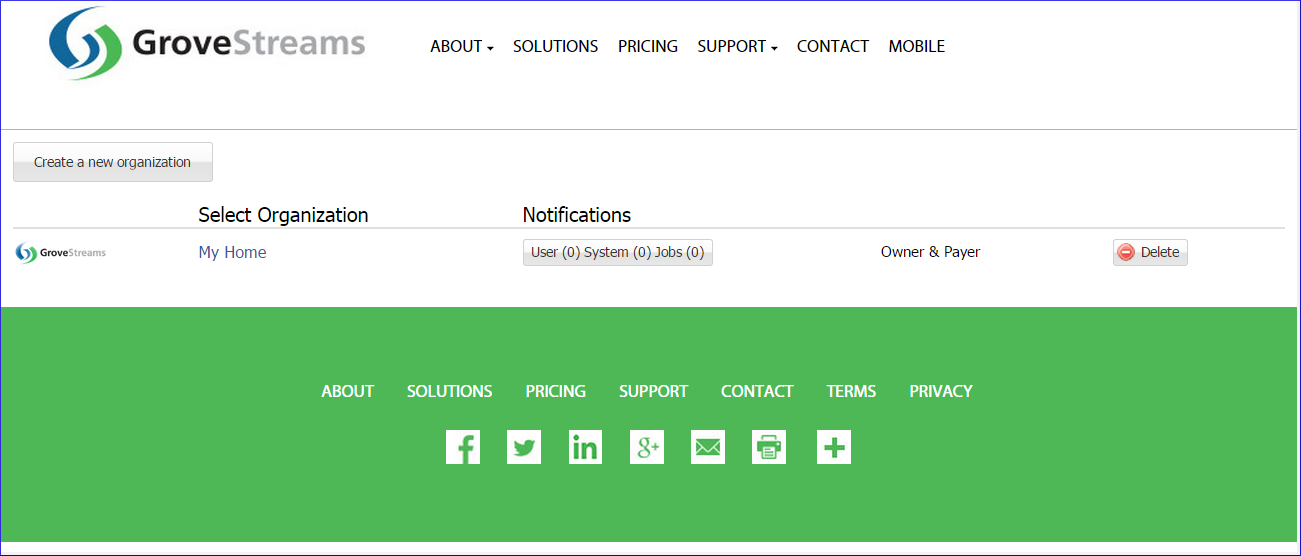 An organization is a Workspace, typically representing a home, business, or organization. Each organization has its own set of components, streams, dashboards, maps, and other items. An organization allows you to control user and device access to the organization. You are automatically the "owner" and given full access rights when you create an organization. Other users may invite you to their organizations with rights they give you. All of the organizations, you "own" or are a member of, will appear in your GroveStreams start page (the first page that appears when you sign in).