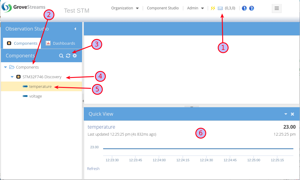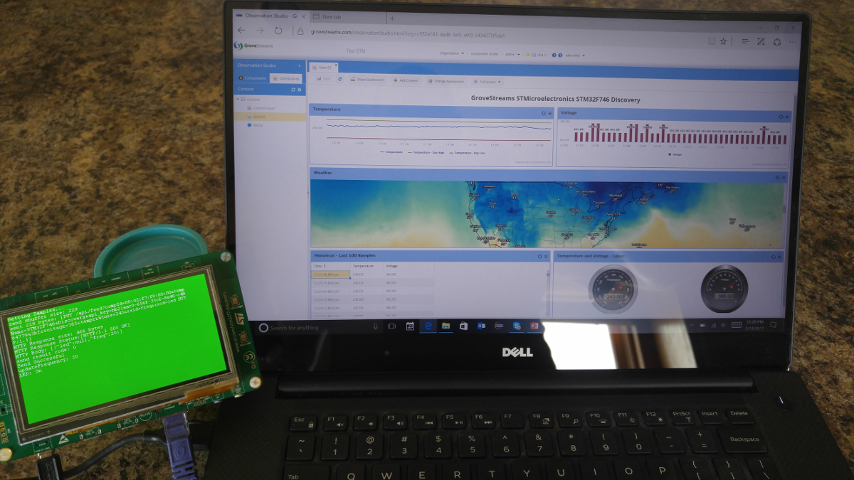 This tutorial walks through the creation of a GroveStreams user account, an organization, and the programming of an STMicroelectronics STM32F746 Discovery board to upload temperature and voltage readings into GroveStreams every 20 seconds.Sample code for this tutorial can be found here: https://developer.mbed.org/teams/GroveStreams/code/GroveStreams-Simple