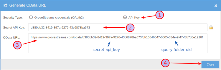 1. Select API Key. Some reporting tools support OAuth2, but using an API key allows OData report users to access data without a GroveStreams account. In contrast, the OAuth2 option requires reporting users to have a GroveStreams account. When OAuth2 is used, the reporting tool will prompt for the user’s GroveStreams email and password. The user must have Read and Traverse rights for the selected query folder. Some reporting tools do not support OData with OAuth2 security. For example, Desktop MS Power BI Report Builder and Public Desktop Tableau do not support third-party OAuth2 authentication.