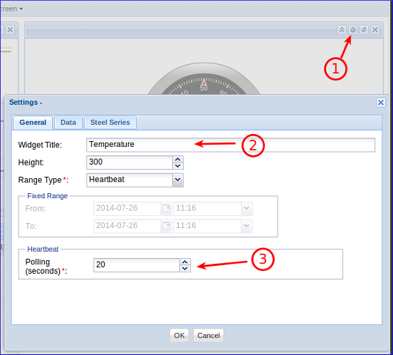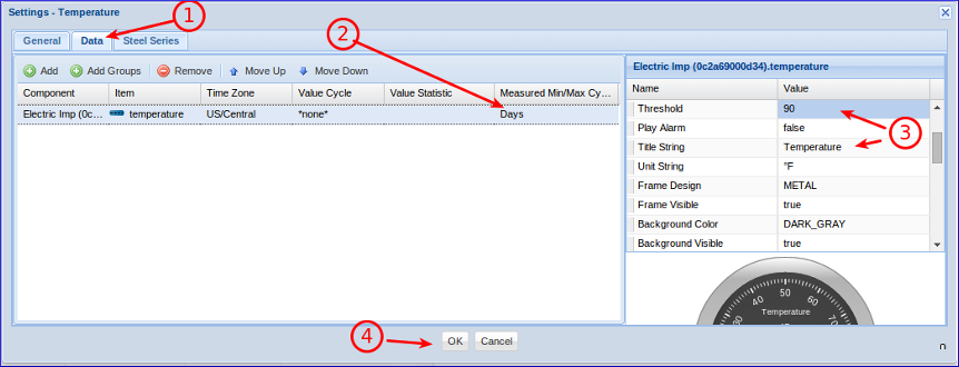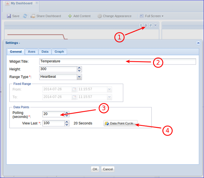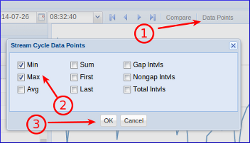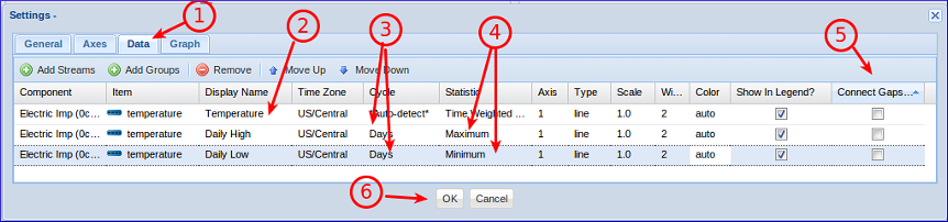 Three data series, each a stream, were added when the temperature stream was dragged and dropped onto the line graph widget threes times. Next we'll configure two of the series to report the Daily High and Daily Low of the current day along with the current temperature. Edit the line graph data series: