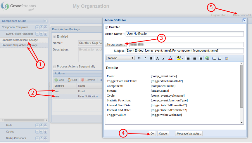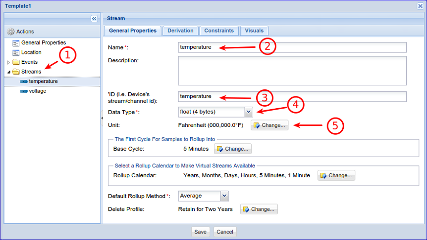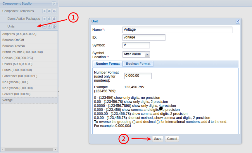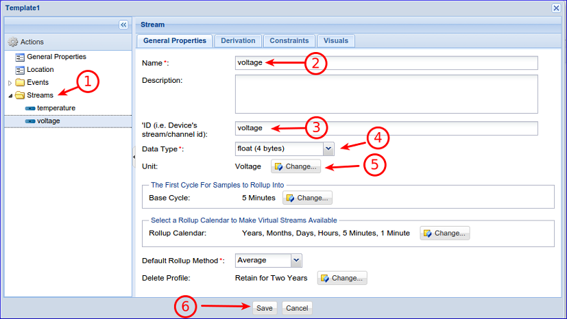 We will first create a component template with each stream associated with a Rollup Calendar and Units. GroveStreams created some units when the organization was created, but we need to create one more: a Voltage unit.