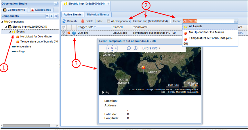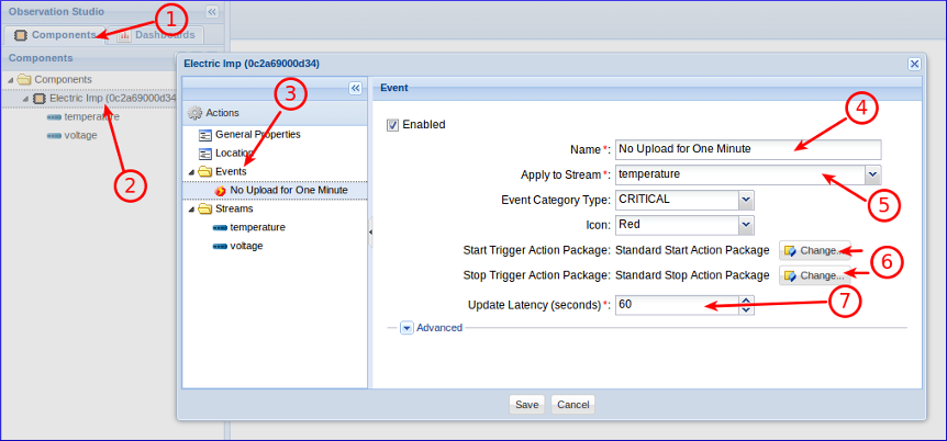 Create a Latency Event that will trigger when data for the temperature stream has not been uploaded for at least 60 seconds: