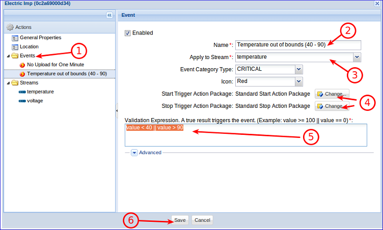 Create an Value Event that will trigger when a value is less than 40 or greater than 90 degrees: