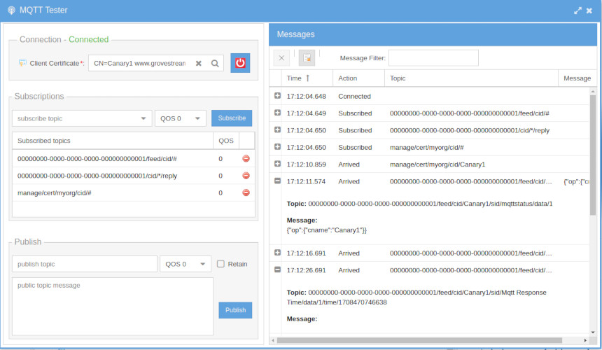 Devices can upload their data into GroveStreams with the GroveStreams' MQTT API and X.509 certificates. Certificate operations include detecting expiring certificates, rolling certificates and publishing custom topics with messages. Operations can be scheduled.