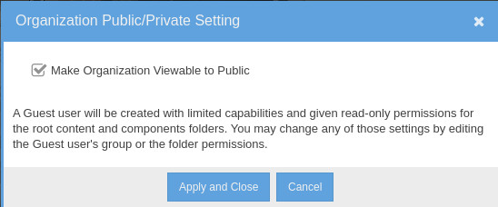 Settings: By default, your organization is private. You can add users to your organization and give them each rights. You can also give access to parts of your organization to anonymous users.