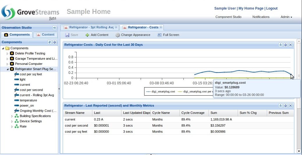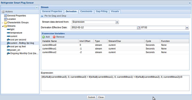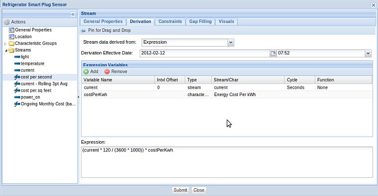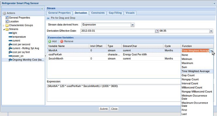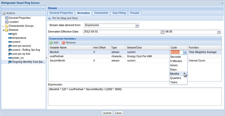 An example of a derived stream called "Ongoing Monthly Cost", which is the result of calculating the monthly cost for operating a refrigerator based on the one second stream called "current": The "current" stream has been associated with a Rollup Calendar, and therefore, has rollup statistic functions available at derivation time.