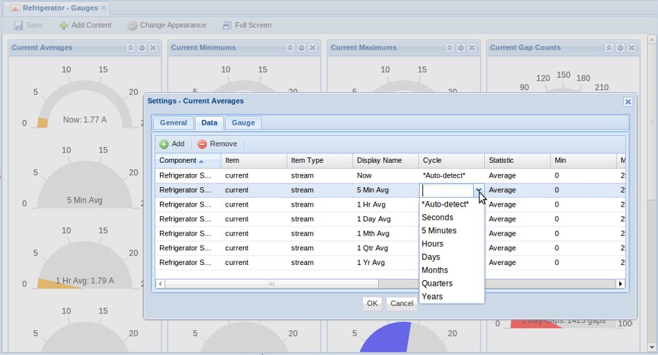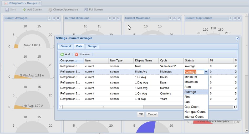 Dashboard Widgets - Rollups: Below is a dashboard displaying a single stream's latest base cycle value and many of its rollup statistics at the same time. Each rollup value being gauged is calculated in near real-time as the device uploads data.